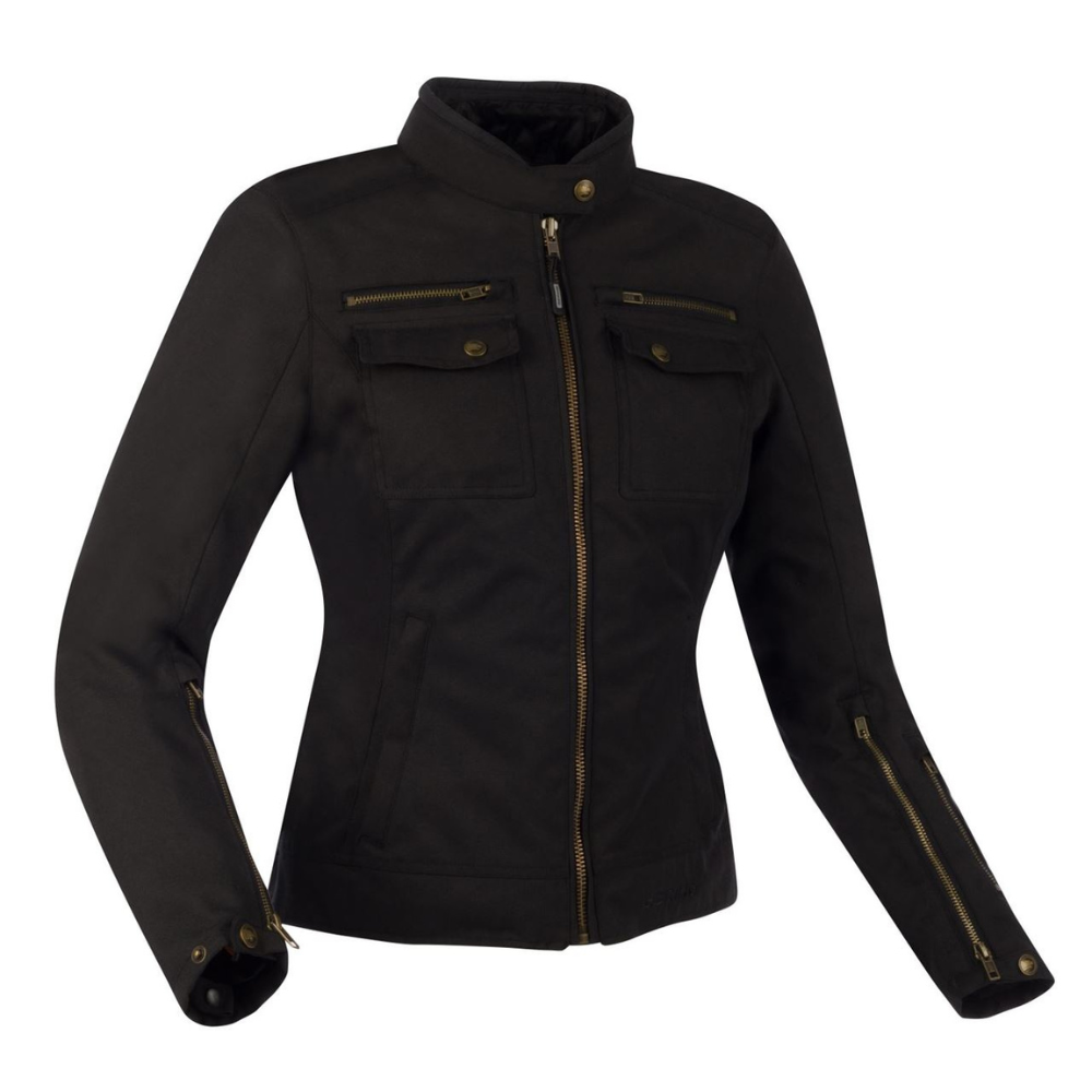Chaqueta de estilo clásico y urbano diseñada específicamente para mujer. Confeccionada en poliéster, se adapta perfectamente a todo tipo de condiciones climáticas gracias a la membrana impermeable y al forro térmico extraíble. Dispone de protectores ALPHA extraíbles en hombros y codos con certificación CE para una mayor protección.