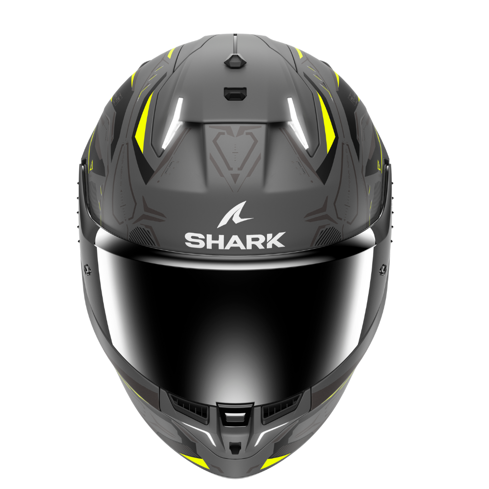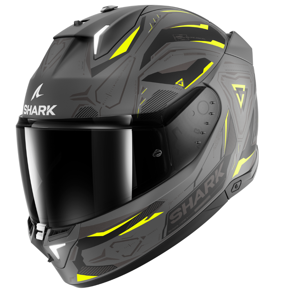 Un casco extraído directamente del mundo del motociclismo y la ciencia ficción. Esta combinación de aerodinámica y robótica acentúa la iluminación.