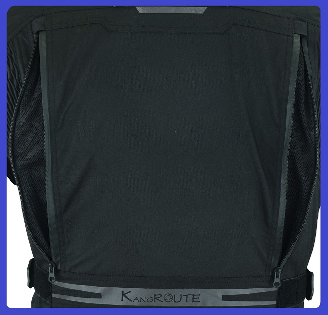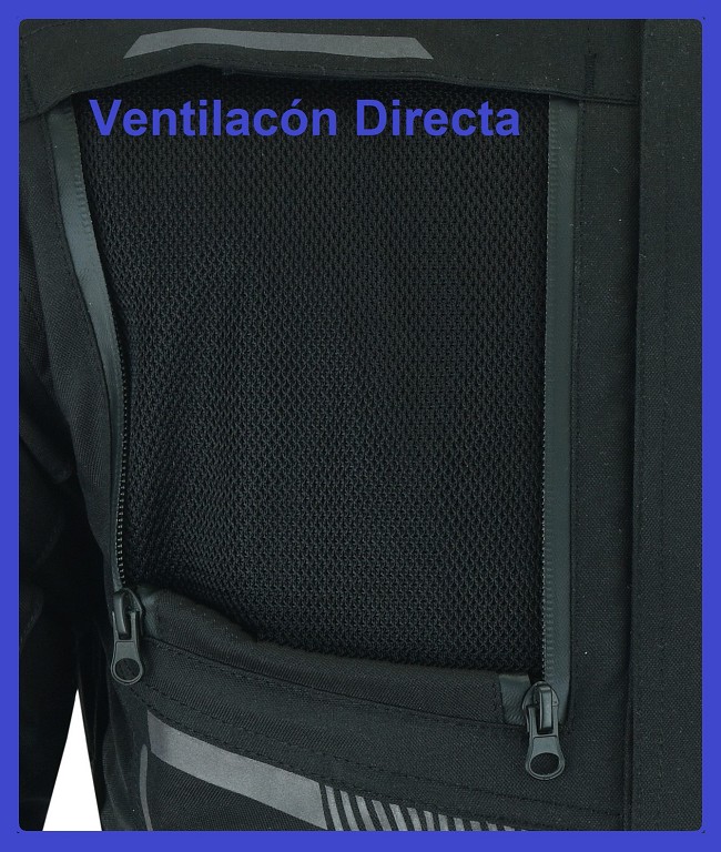 Dispone de amplias entradas de aire en la espalda con cremalleras impermeables.