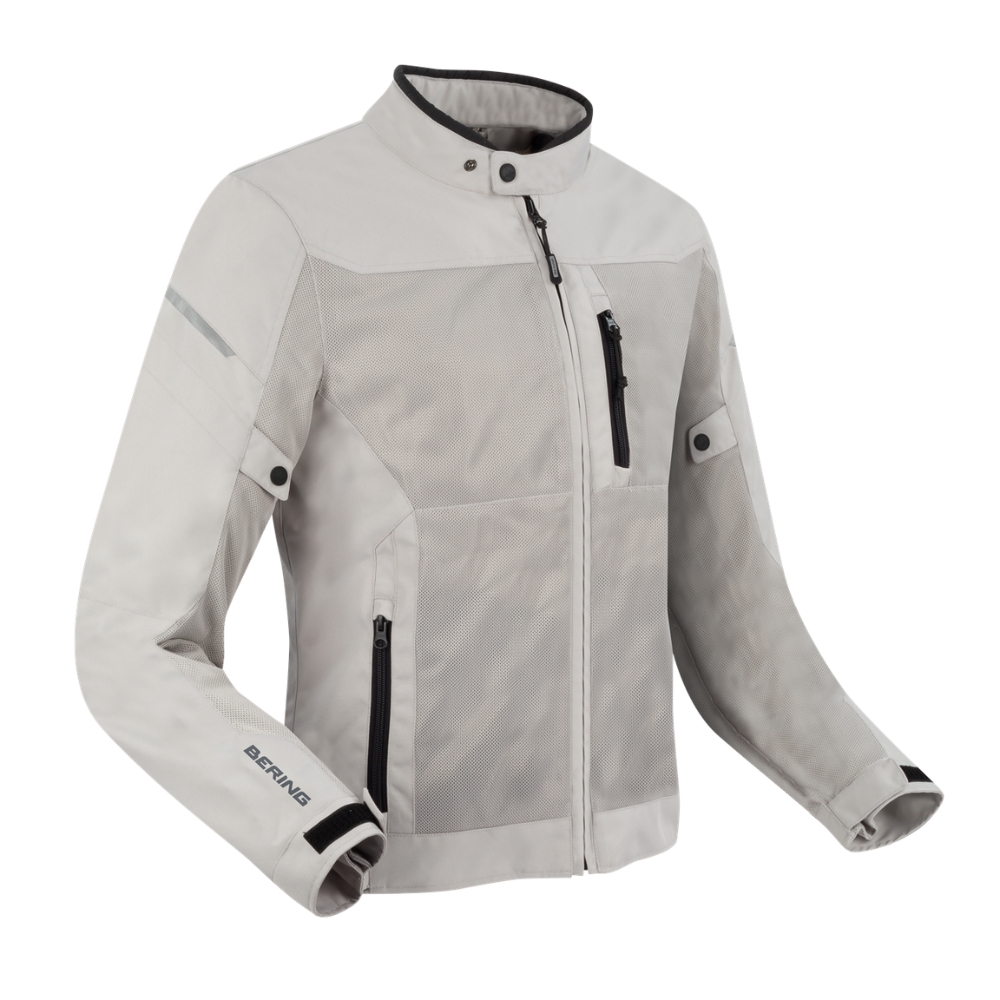 Chaqueta Bering Ozono . Chaqueta touring con paneles de malla ventilados para el verano. Fabricado en Fibratech 600D de alta resistencia a la abrasión. Destaca por su membrana impermeable removible que le permite adaptarse según las condiciones climáticas. Incorpora protecciones ALPHA extraíbles en hombros y codos, así como la posibilidad de montar un protector de espalda (no incluido).