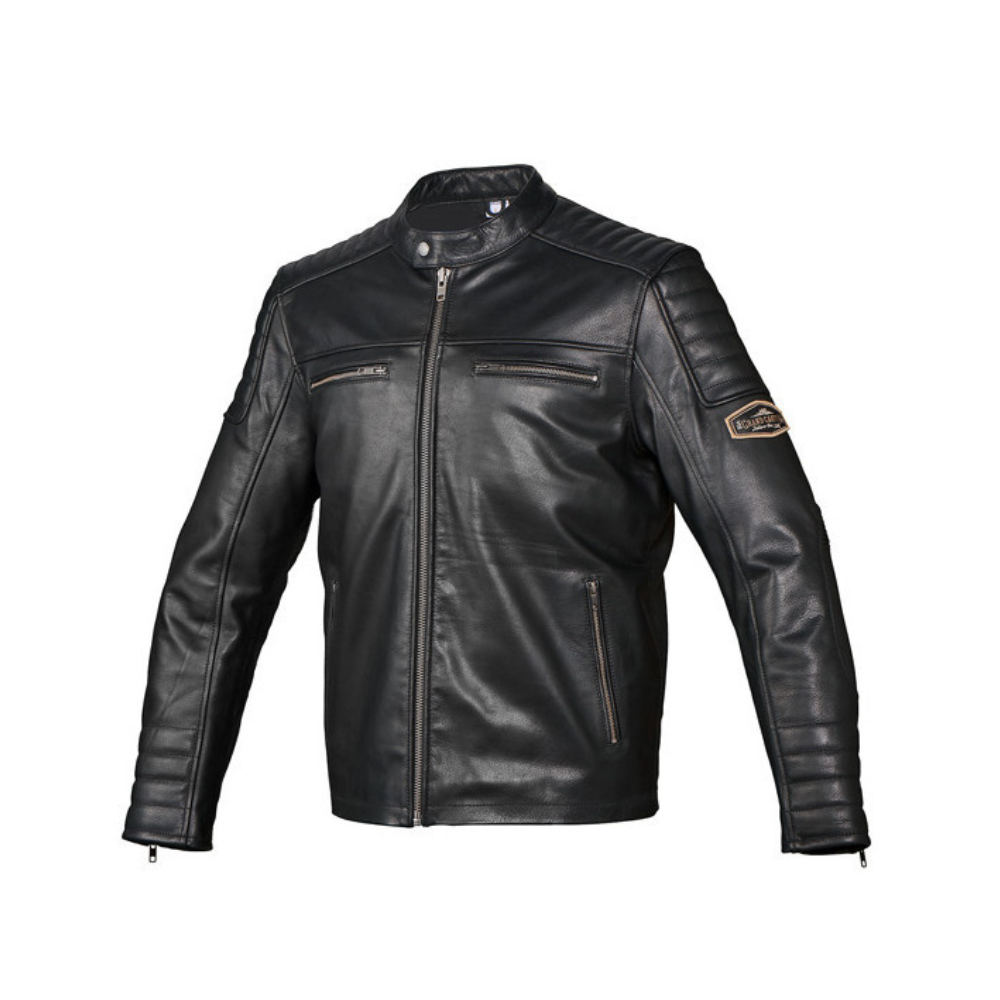 - 100% couro de búfalo forte - Alongamento nos ombros e cotovelos - Gola com fecho de pressão - Zíper YKK na cor níquel - Forro de algodão - 4 zíperes de ventilação - 4 bolsos externos e 2 bolsos internos