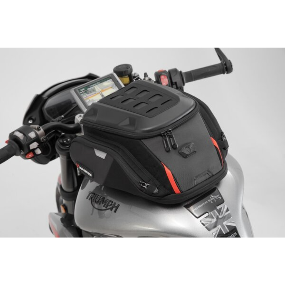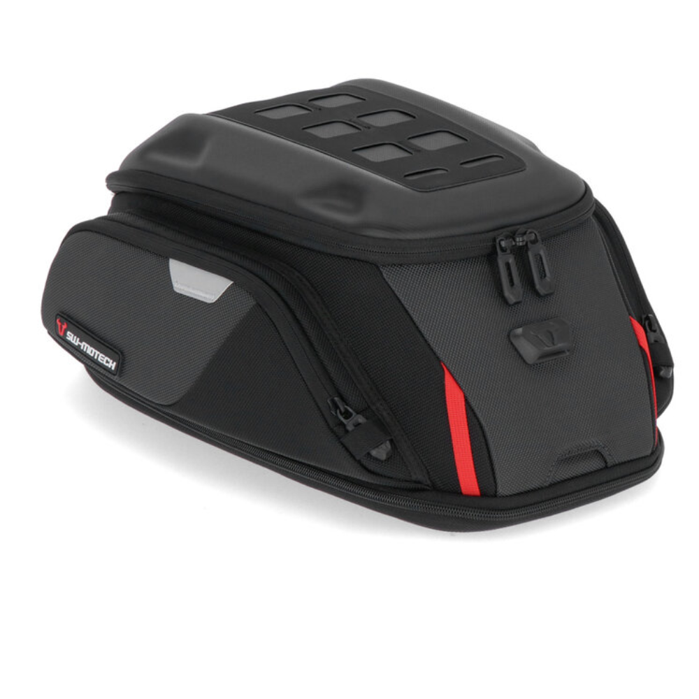 Combinando com isso, a SW-MOTECH oferece os anéis de tanque PRO patenteados feitos de plástico reforçado com fibra de vidro. Eles são feitos para combinar com o modelo da motocicleta. O robusto anel de tanque PRO com auxílio de guia magnética prende os sacos de tanque PRO com uma trava mecânica QUICK-LOCK. Isso permite que os sacos do tanque sejam anexados ou removidos com apenas uma mão.