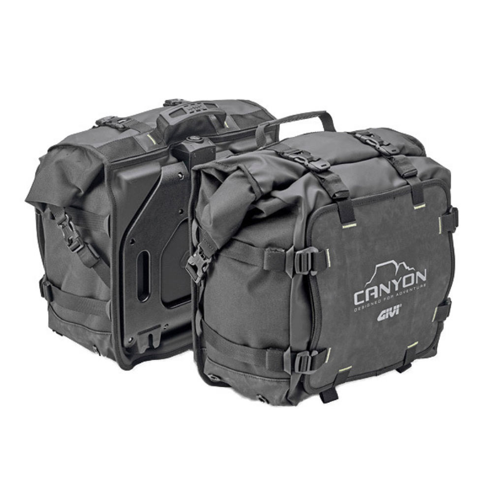 Bolsas laterais para a motocicleta Givi GRT720 25L , equipadas com alças ajustáveis com fecho de fivela e providas de fecho de pacote com fecho rápido autoadesivo.
