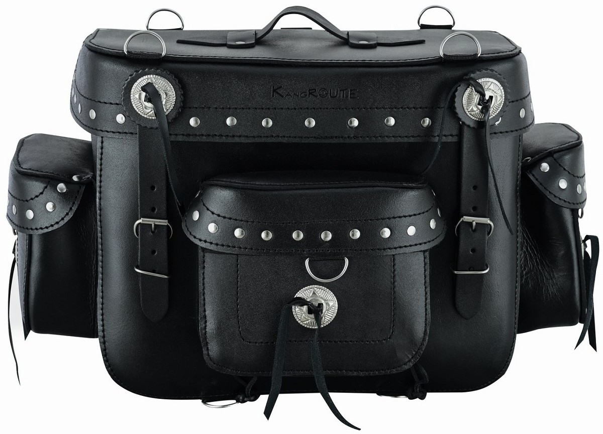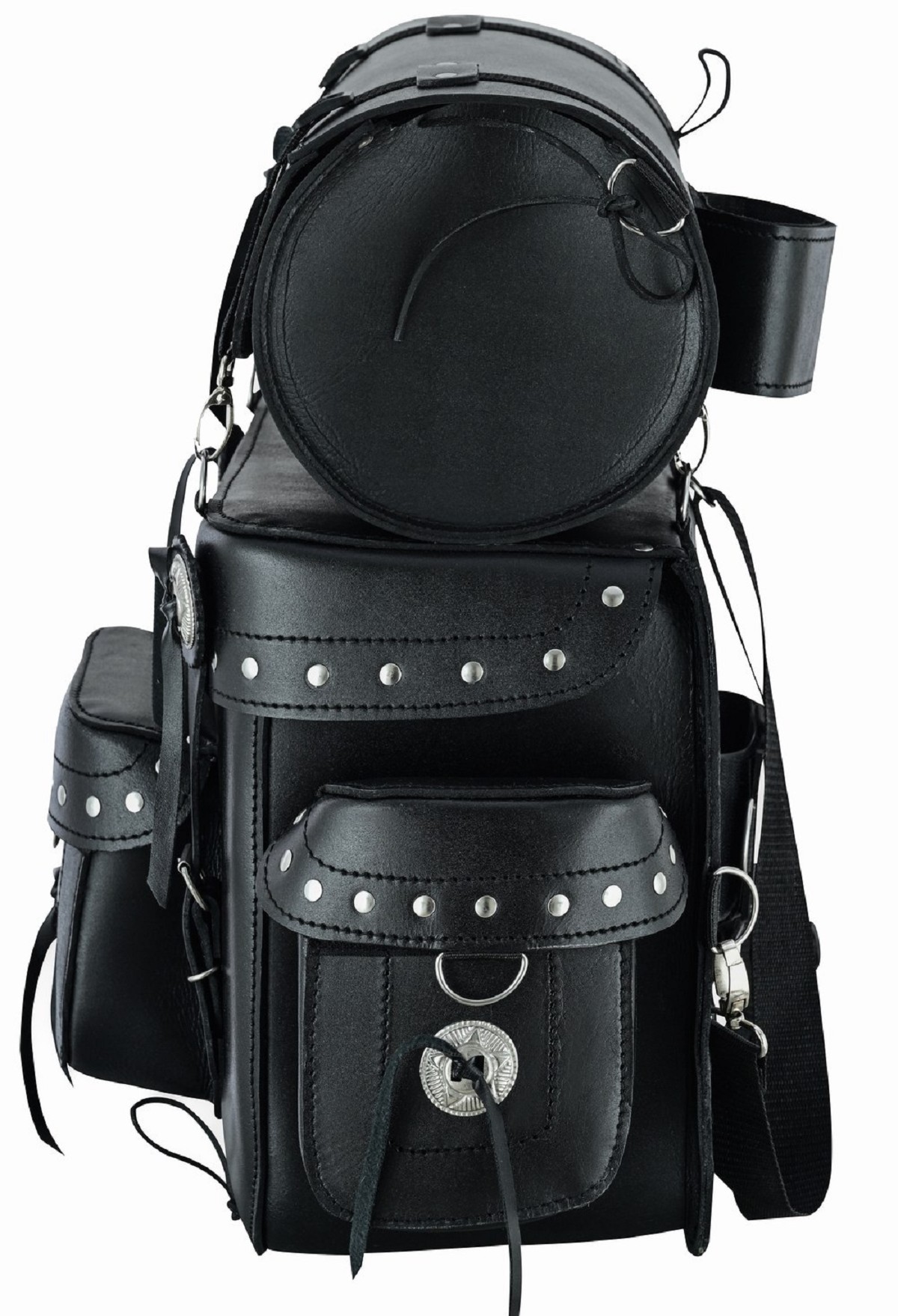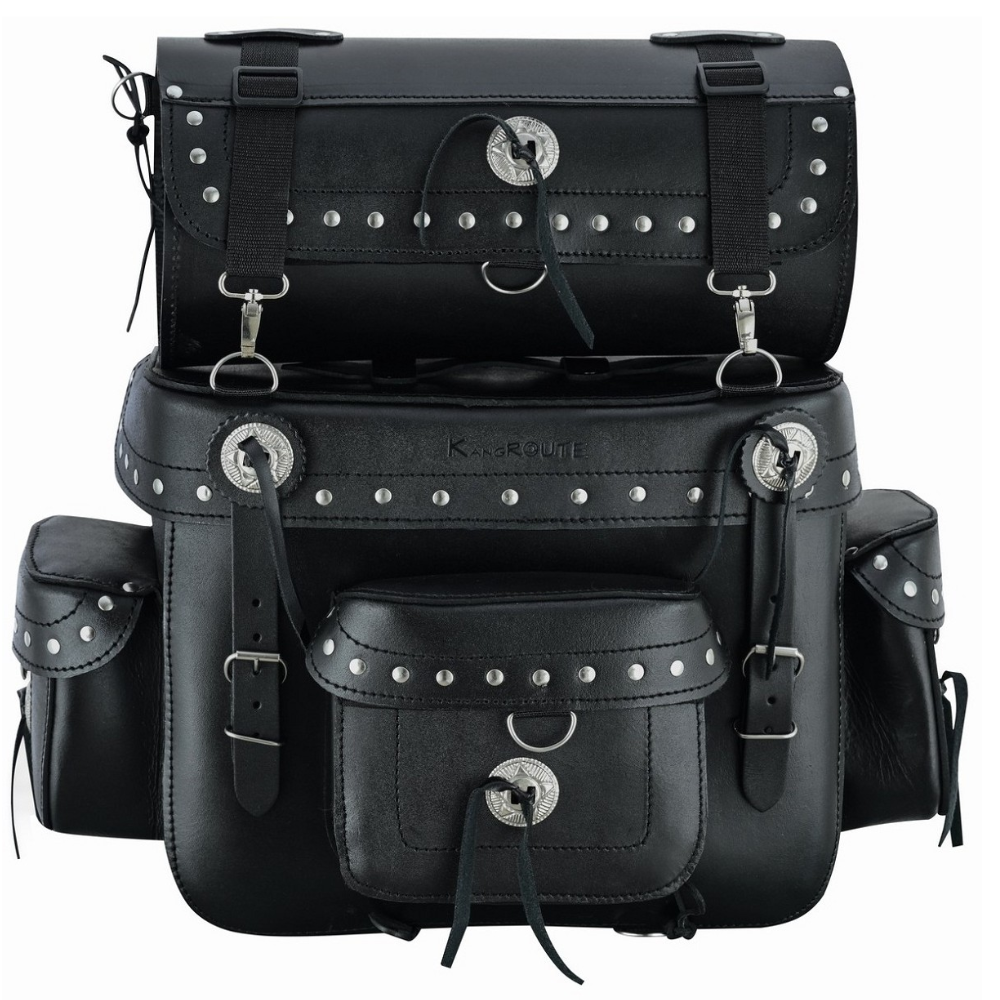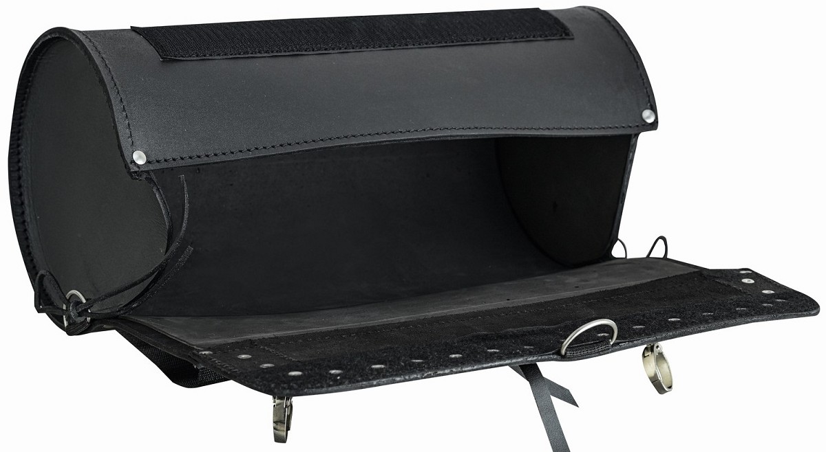 Baú de couro com rolo de bagagem para fixar aos encostos do sissy bar.