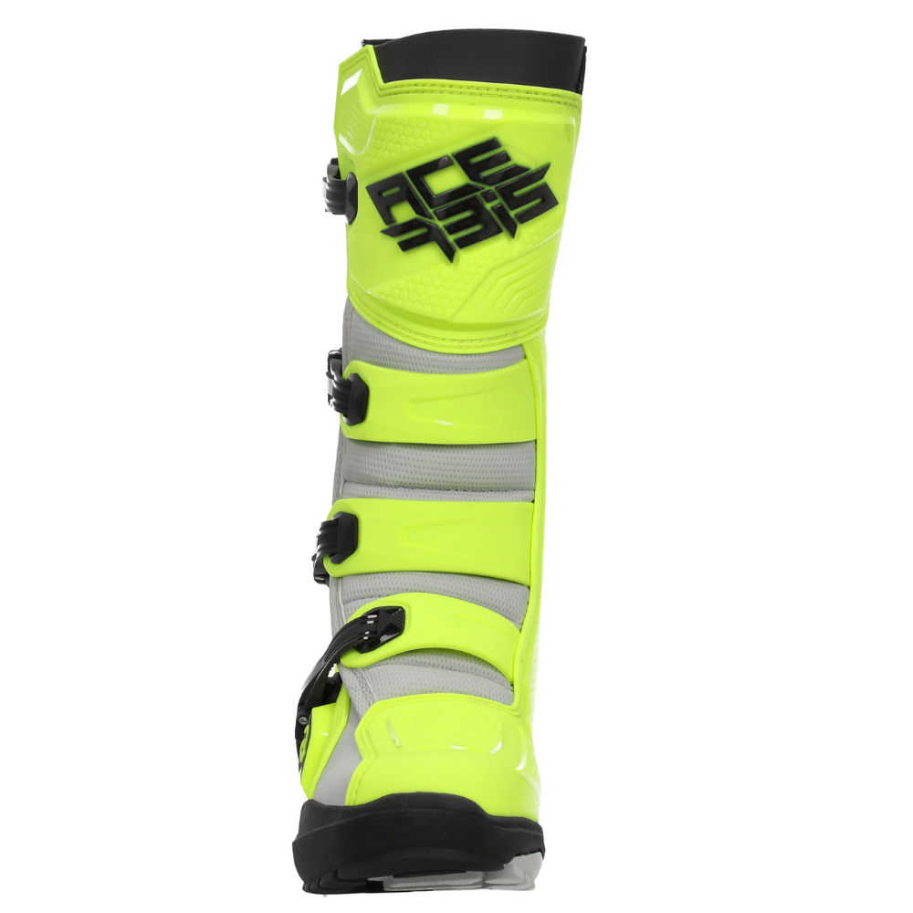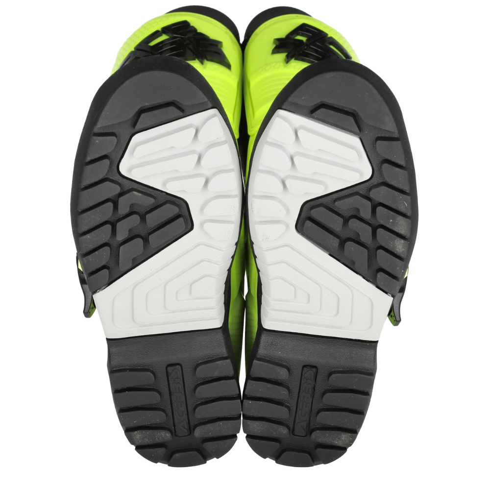 Um logotipo na caneleira e no calcanhar, logotipo da Acerbis nas costas.