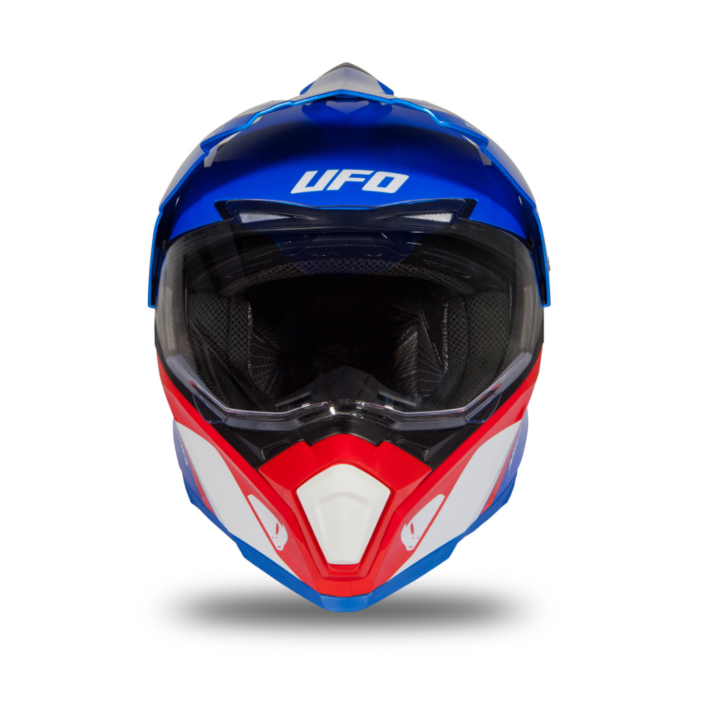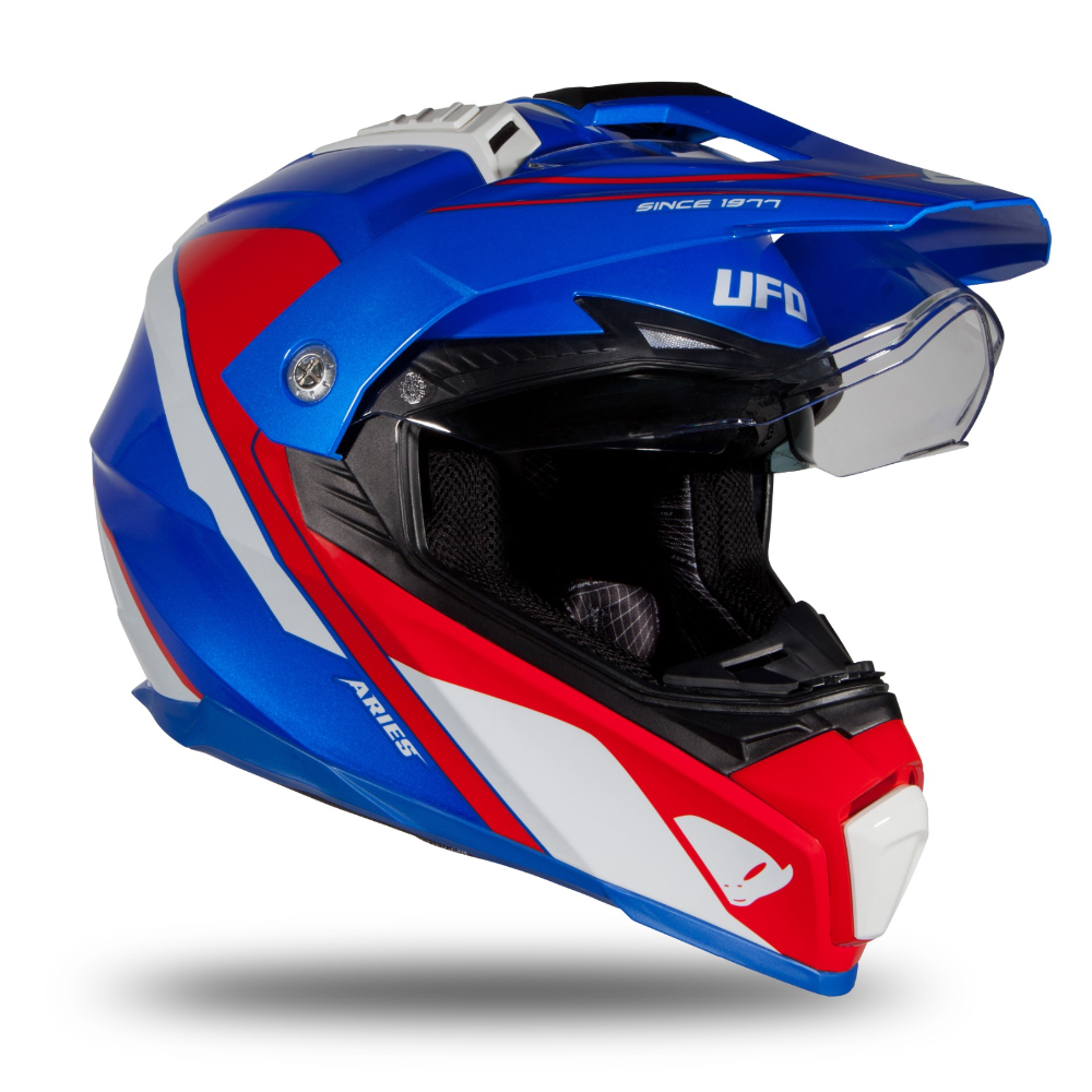 A grande viseira em policarbonato transparente, resistente a arranhões, é removível para permitir o uso do capacete com óculos off road, combinada com uma segunda viseira interna anti-UV fumada e o pico aerodinâmico do capacete derivado do MX (removível para uso na estrada) garantem excelente visibilidade em qualquer condição.