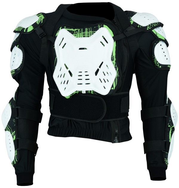 Nove tipos de proteção, principalmente nos cotovelos, ombros, antebraços, peito e costas.