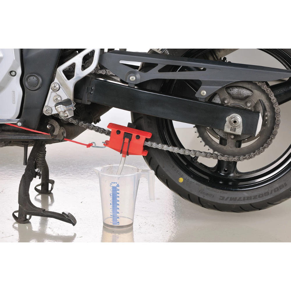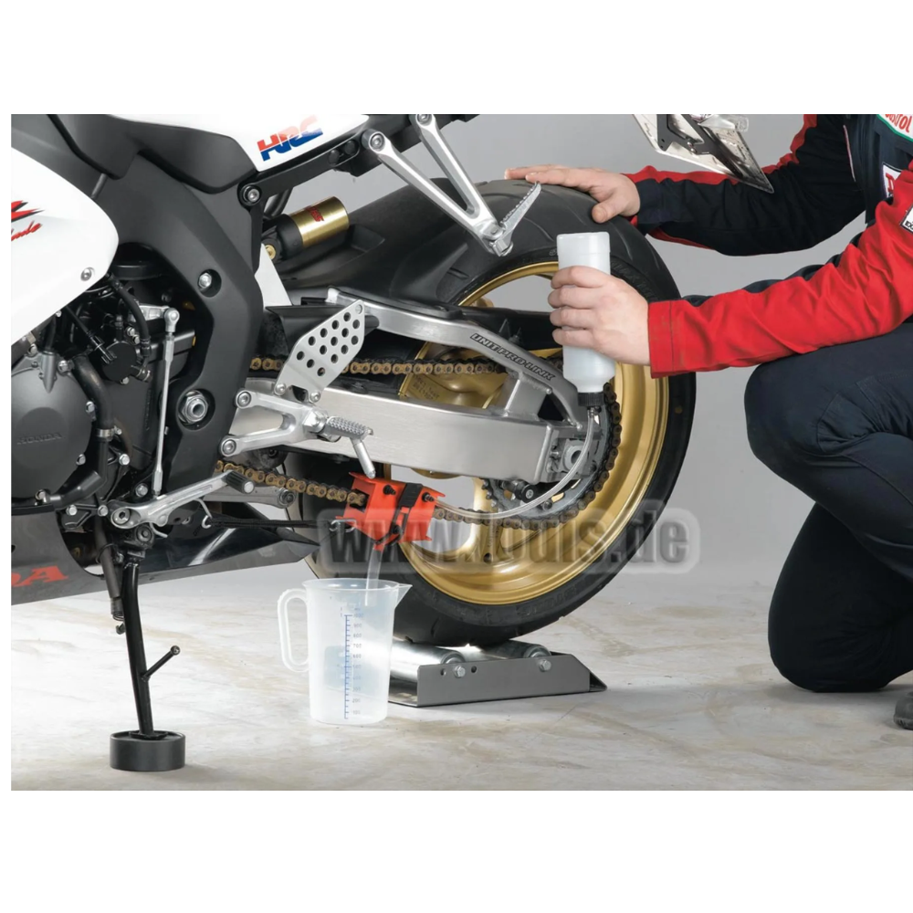 O lubrificante não é projetado para o pneu traseiro, primeiro porque é pulverizado em pequenas quantidades controladas e, segundo, devido à aplicação e distribuição precisas. Testado em pista de corrida.