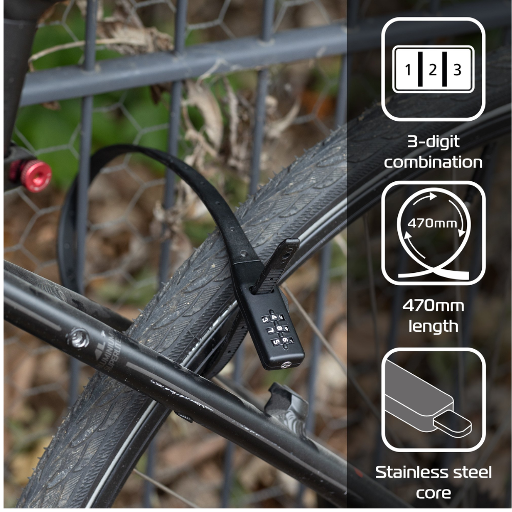 Com um núcleo de aço inoxidável e uma fechadura combinada, você pode enfiá-lo em praticamente qualquer coisa, adicionando uma camada adicional de segurança para deter um ladrão oportunista. O design compacto significa que é fácil de transportar ou prender na sua bicicleta ou bolsa, para que esteja pronto para usar sempre que você precisar.