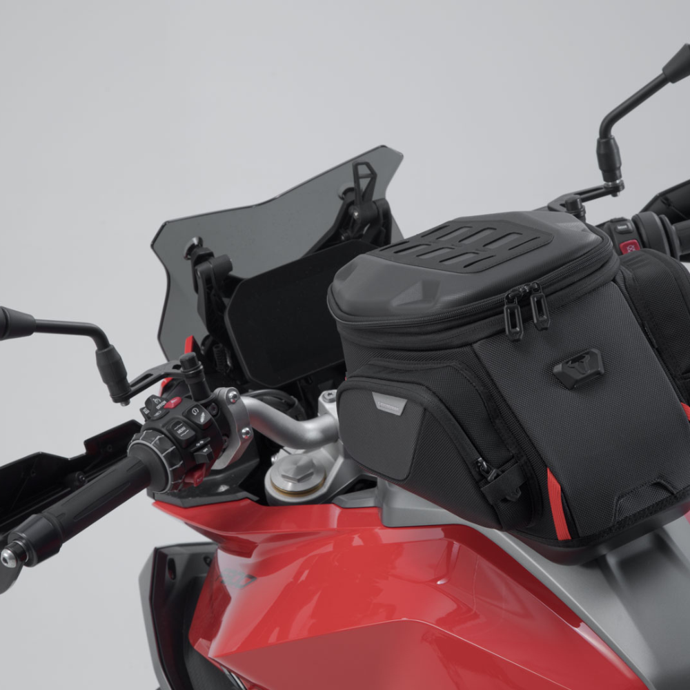 Combinando com isso, a SW-MOTECH oferece os anéis de tanque PRO patenteados feitos de plástico reforçado com fibra de vidro. Eles são feitos para combinar com o modelo da motocicleta. O robusto anel de tanque PRO com auxílio de guia magnética prende os sacos de tanque PRO com uma trava mecânica QUICK-LOCK. Isso permite que os sacos do tanque sejam anexados ou removidos com apenas uma mão.