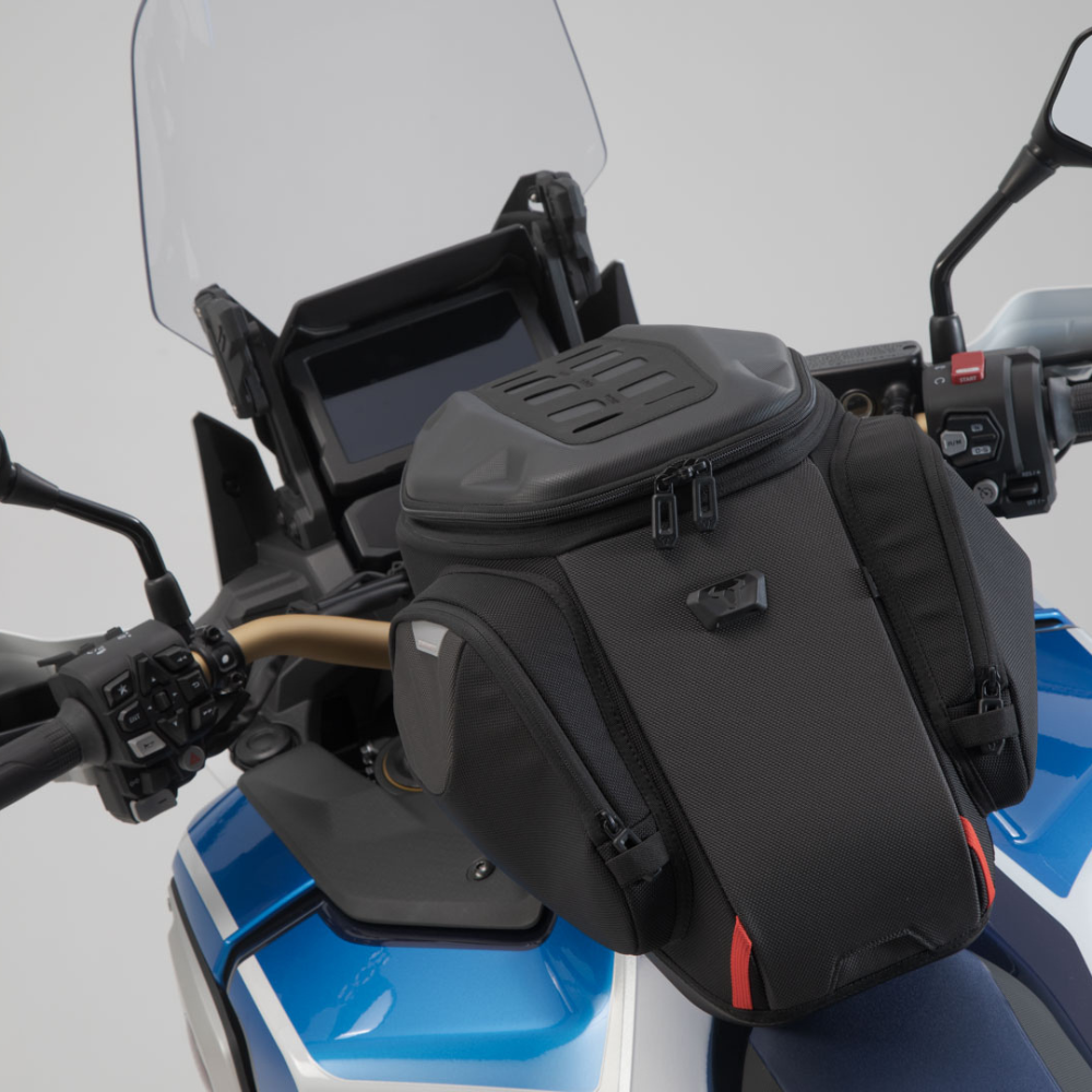 Combinando com isso, a SW-MOTECH oferece os anéis de tanque PRO patenteados feitos de plástico reforçado com fibra de vidro. Eles são feitos para combinar com o modelo da motocicleta. O robusto anel de tanque PRO com auxílio de guia magnética prende os sacos de tanque PRO com uma trava mecânica QUICK-LOCK. Isso permite que os sacos do tanque sejam anexados ou removidos com apenas uma mão.