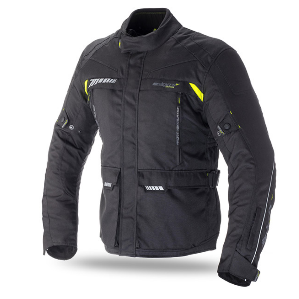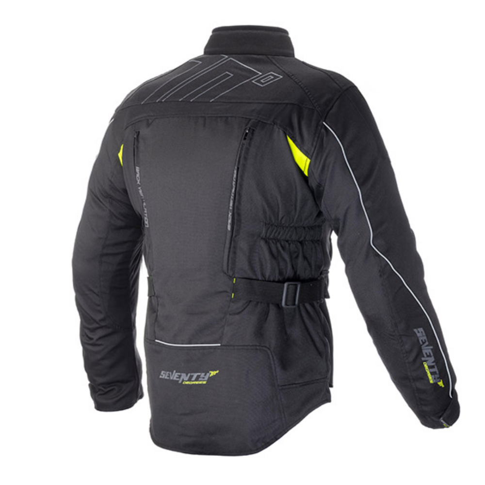 Jaqueta de corrida esportiva, construída em tecido externo em poliéster 600D de alta resistência. Tem inserções de neoprene no pescoço para maior conforto. Inclui um revestimento térmico removível e uma membrana que o torna 100% à prova d'água. Também é equipado com ventilações na parte frontal e traseira para aumentar a respirabilidade. Armadura homologada nos ombros, cotovelos, antebraços e costas. Correias de ajuste nos braços e na cintura para evitar o abanar.