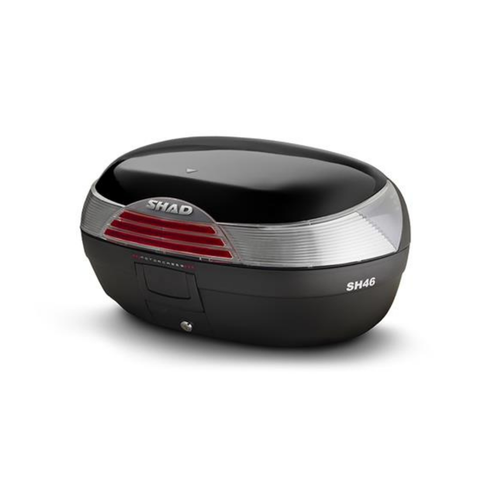 O SH46 é um baú muito robusto, feito de polipropileno reforçado de alta qualidade. O porta-malas resiste a temperaturas extremas e protege a carga interna de impactos e quedas. Tem capacidade para 2 capacetes modulares deitados, além de acessórios de viagem, com um design renovado de formas curvas, aplicando retrorrefletores na cor preto piano juntamente com três linhas vermelhas minimalistas de diferentes dimensões. Tem o tamanho perfeito tanto para se deslocar pela cidade como para viagens mais longas, o que lhe permite adaptar-se tanto a scooters como a motos de média e grande cilindrada.