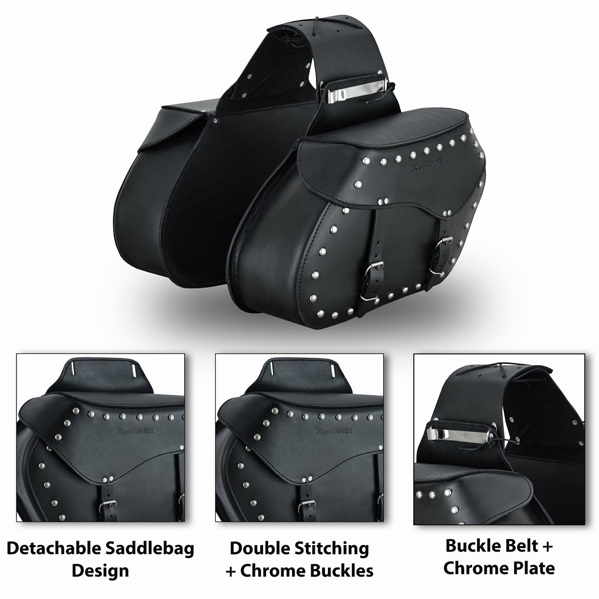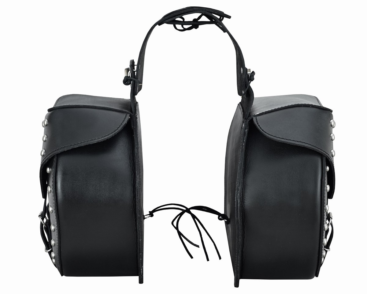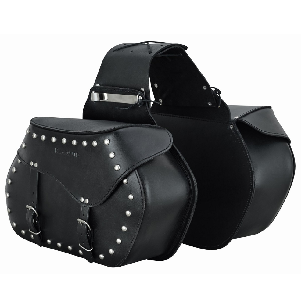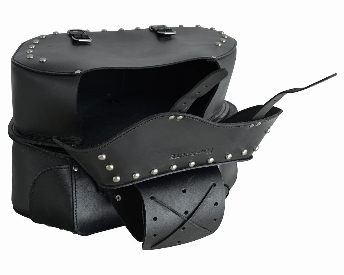 Alforjas laterales fabricadas en piel vacuna laminada con tratamiento hidrófugo, duradero y resistente a la intemperie, con un generoso espacio de almacenamiento de 20 litros cada una. Las alforjas se aseguran fácilmente mediante un nuevo sistema con cerraduras y grandes correas debajo del asiento. Además, los clips laterales y las correas ofrecen otras opciones para fijarlos al vehículo.