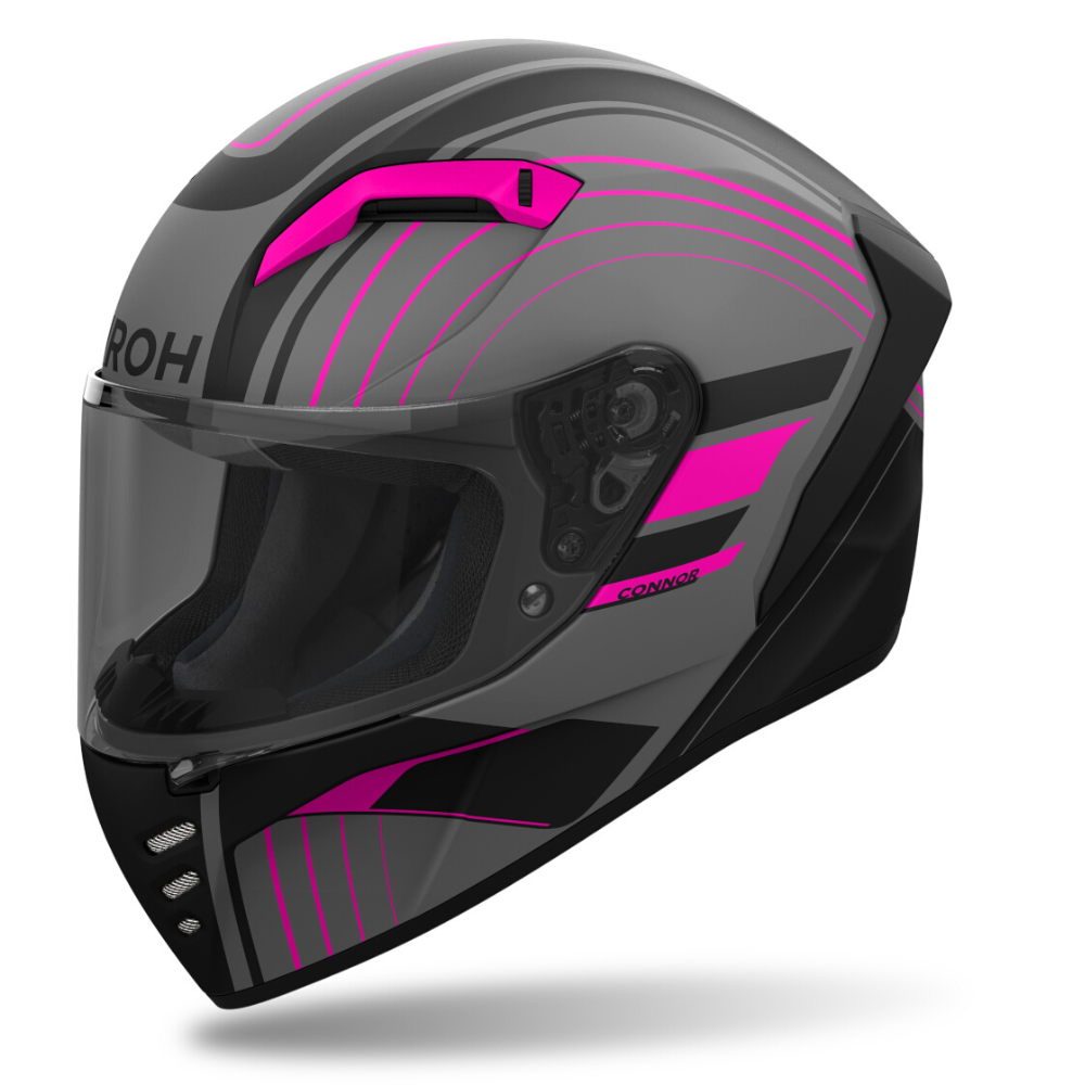 Ventilación: Connor dispone de un sistema de ventilación innovador y funcional, cuidadosamente estudiado y probado dentro del túnel de viento. Las entradas de aire situadas en la parte superior y en la mentonera son fácilmente ajustables, incluso con guantes. Los extractores traseros completan el sistema y enfatizan el placer de conducir, mejorando el confort incluso en trayectos más largos y en condiciones climáticas más exigentes.