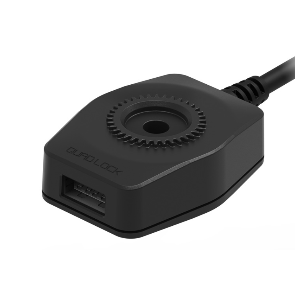 El cargador está perfectamente ubicado debajo del cabezal de montaje Quad Lock para proporcionar alimentación USB sin necesidad de cables de carga largos.
