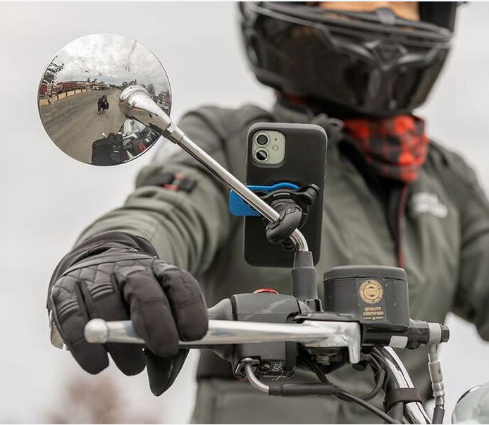 El soporte para espejo Quad Lock® le permite fijar de forma segura su teléfono a postes de espejo estándar y barras pequeñas en motocicletas y scooters.