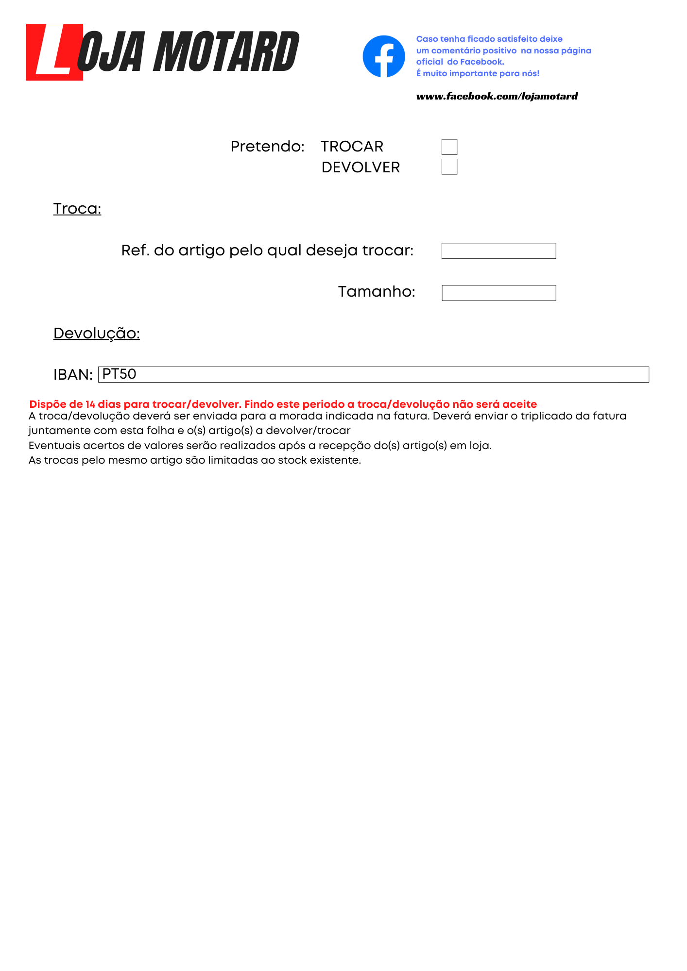 Si el artículo no se corresponde con el adquirido, está dañado o defectuoso, recogemos y enviamos el nuevo artículo, corriendo Loja Motard con los costes de todo el proceso.