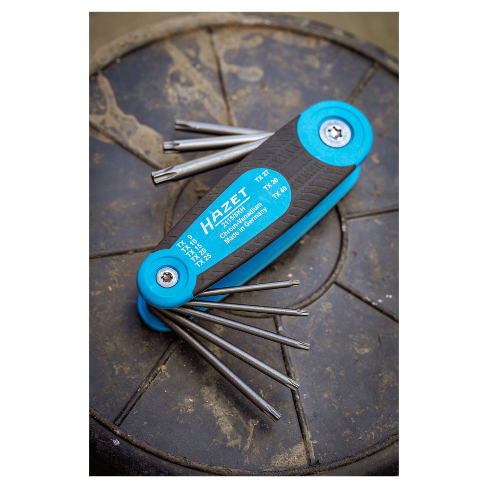 Its appearance strongly resembles a multifunction pocket knife. Compact, handy, practical. Only the HAZET is hardly suitable for cutting, sawing and opening cans, but the tool combines 8 offset screwdrivers with inner star profile in itself.