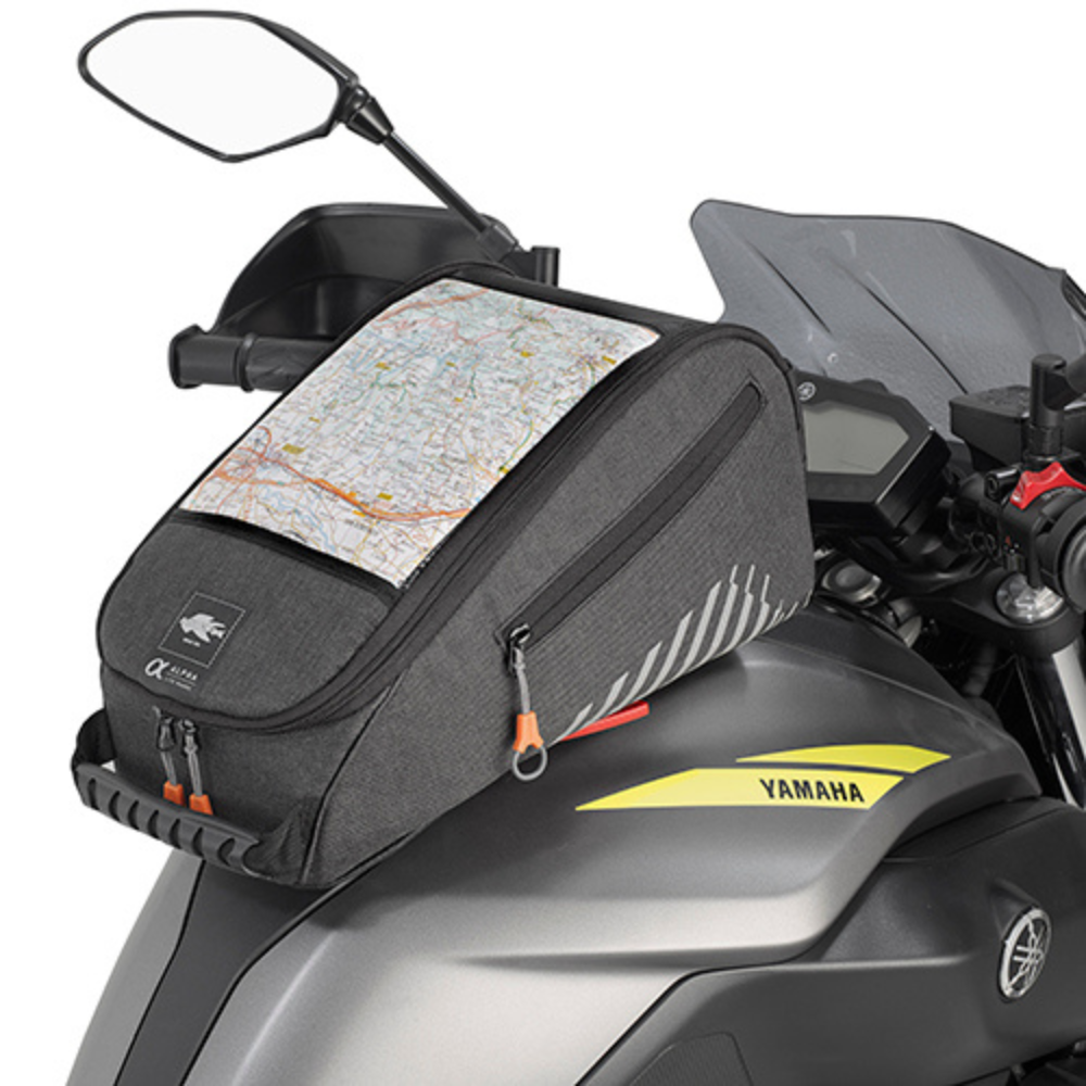 Saco de Depósito com sistema TANKLOCK Características: - Suporte transparente para mapa; - Capa de chuva; - Impressões refletoras; - Alça frontal; - Cinto de segurança central a ser fixado ao redor do guiador.