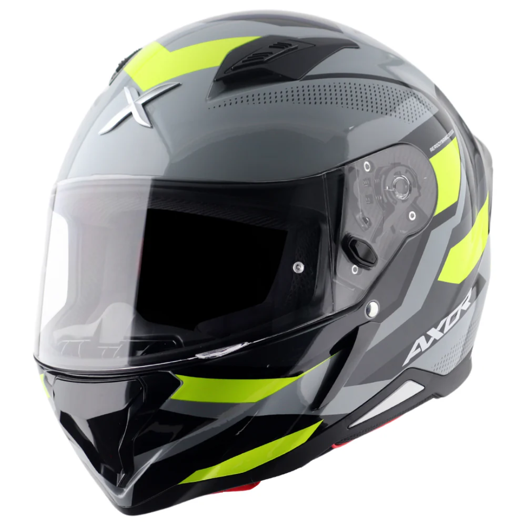 O capacete AXOR Hunter foi concebido com perícia para o motociclista entusiasta, contando com certificações ISI, DOT e ECE 22.06 para máxima segurança. Inclui uma viseira resistente a riscos e aos raios UV, com um prático mecanismo de libertação rápida que permite a substituição fácil da viseira. O capacete dispõe ainda de um botão de bloqueio da viseira.