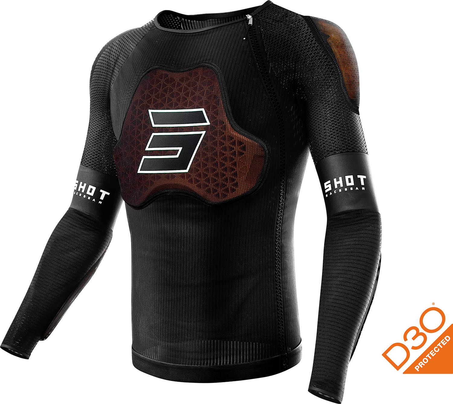 • Costas, peito, cotovelos e ombros com proteção flexível D3O®